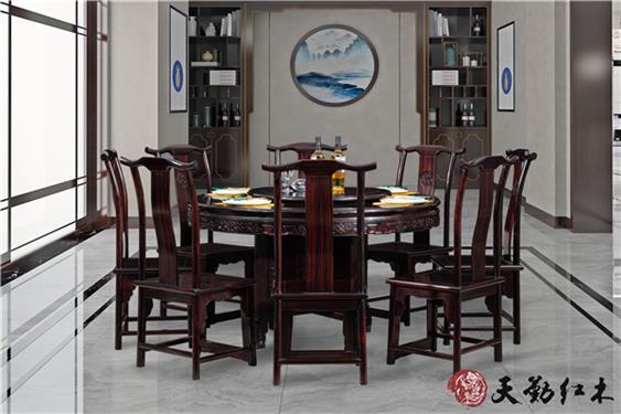天勤紅木 材質(zhì):條紋烏木 1.38m新中式圓臺(tái)配新中式餐椅圖片及家具信息